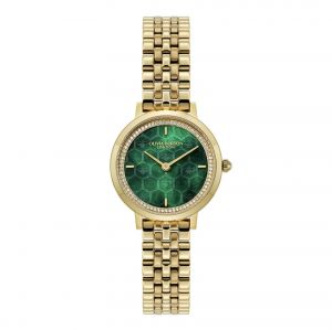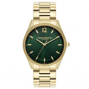 Olivia Burton apresenta duas variações impactantes em verde: o modelo Radiate, com acabamento sunburst e pulseira dourada, e a versão honeycomb , com textura perolada e detalhes em microcristais, reforçando também a tendência dos mini watches.