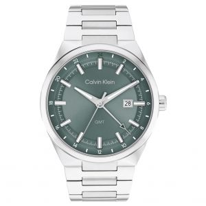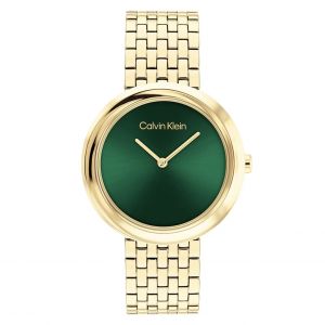 Calvin Klein traz o verde em mostradores vibrantes que acompanham designs esculturais. O modelo feminino conta com pulseira dourada, bezel torcido e mostrador texturizado, enquanto a versão masculina aposta em robustez e funcionalidade com função GMT, pulseira H-link e visual imponente.