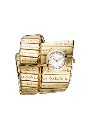 Uma inscrição intimista adorna o bracelete, retirada do romance sobre Frida “Diarios de un accidente”, de Beatriz Alvarado, e inspirada nos textos da artista. Uma inscrição que descreve “Mais de mil maneiras de beijar” foi cuidadosamente selecionada, e batidas foram gravadas em cada curva da Manchette Tubogas, feita em ouro amarelo.