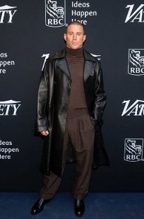 No TIFF Variety Party, Channing Tatum usou um trench coat preto de couro nappa com abotoamento duplo, combinado com um suéter de gola alta em tom espresso com detalhe de bolso no peito e calça de alfaiataria plissada em lã faille na mesma cor. Para finalizar o look, um par de sapatos em couro de bezerro com zíper.