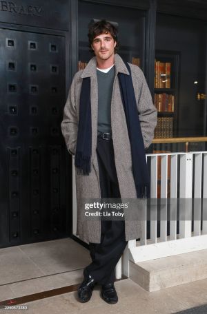 Jacob Elordi foi visto em Londres usando um casaco Ferragamo em espinha de peixe de lã e algodão nas cores espresso e branco, de abotoamento simples.