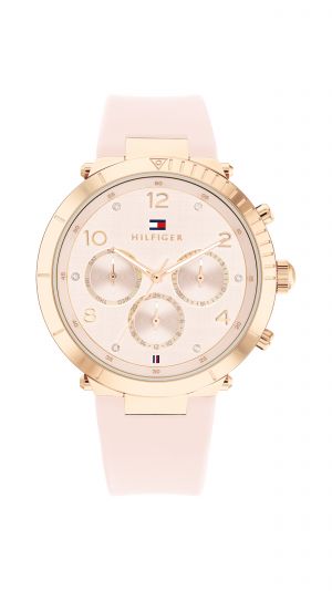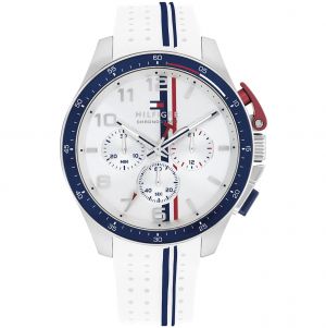 Tommy Hilfiger também explora a tendência com a coleção Bank, que apresenta relógios masculinos com pulseiras integradas de silicone e detalhes esportivos sofisticados, como elementos de aço e mostradores multifunção.