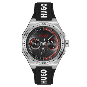 Hugo se destaca com modelos masculinos de design fluido, como o #LIT FOR HIM, que combina caixa em resina leve e pulseira em silicone com logo contrastante, perfeito para o dia a dia urbano.
